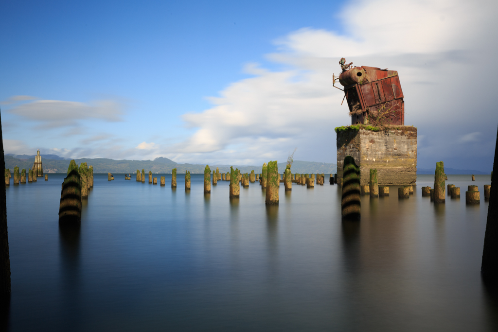 Auf dem Weg ins Stadtzentrum habe ich zufällig ein paar hübsche alte Molenüberreste gesehen und hatte sofort ein Bild im Kopf. Zumal dieses perfekt zu dem Regenschauer passte, der gerade über Astoria zog. Abgebogen, Auto abgestellt und runtergeklettert. Gerade mal drei Aufnahmen habe ich geschafft, bevor die Sonne herauskam. Aber die haben es in sich.