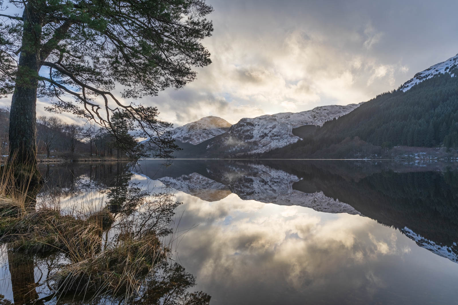 Am Sonntag Nachmittag auf dem Rückweg von Benmore lag das Loch Eck spiegelglatt da, so dass Lorna und ich in einen richtigen Fotorausch verfielen. Das stille Loch mit einer sensationellen Spätnachmittagsstimmung und der schräg stehenden Sonne, die zwischen den Bergen hindurch schien, wirkte erst durch den Schnee so richtig. Ich konnte es kaum fassen, was ich sah. Auch das Titelbild und das Bild unten ist an diesem Nachmittag entstanden, letzteres gehört sicherlich zu meinen besten Fotos des Jahres 2018.